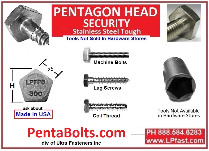 Pentabolts.com is the leader in Penta style fasteners. Available off the shelf in 3/8" and 1/2" dimensions with custom sizes including Metric and a variety of materials available. Penta Bolt is a five-pointed headed tamper-resistant bolt head used in the civic / municipal / government infrastructure.